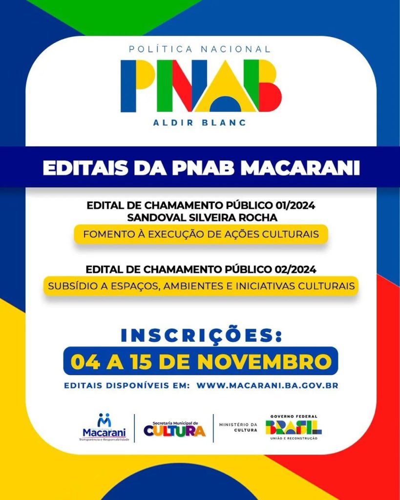 A Prefeitura de Macarani, por meio da Secretaria Municipal de Cultura, anunciou a abertura das inscrições para os editais da Política Nacional Aldir Blanc (PNAB). Entre os dias 04 e 15 de novembro, artistas, produtores e fazedores de cultura do município poderão se inscrever para receber apoio financeiro voltado à execução de ações culturais e ao subsídio de espaços, ambientes e iniciativas culturais.